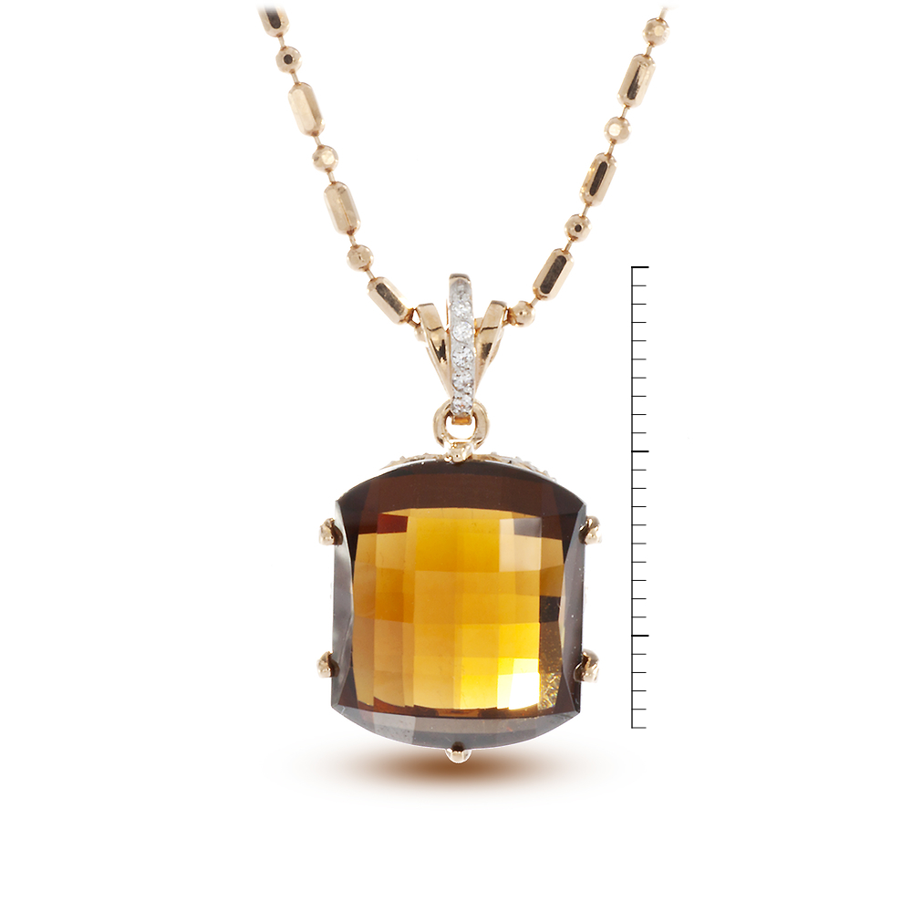 Золотой кулон с крупным цитрином необычной огранки. В этом украшении подчеркнута красота и глубина камня. Цитрин символизирует свет, радость и хорее настроение. Высота изделия - 2,5 см.